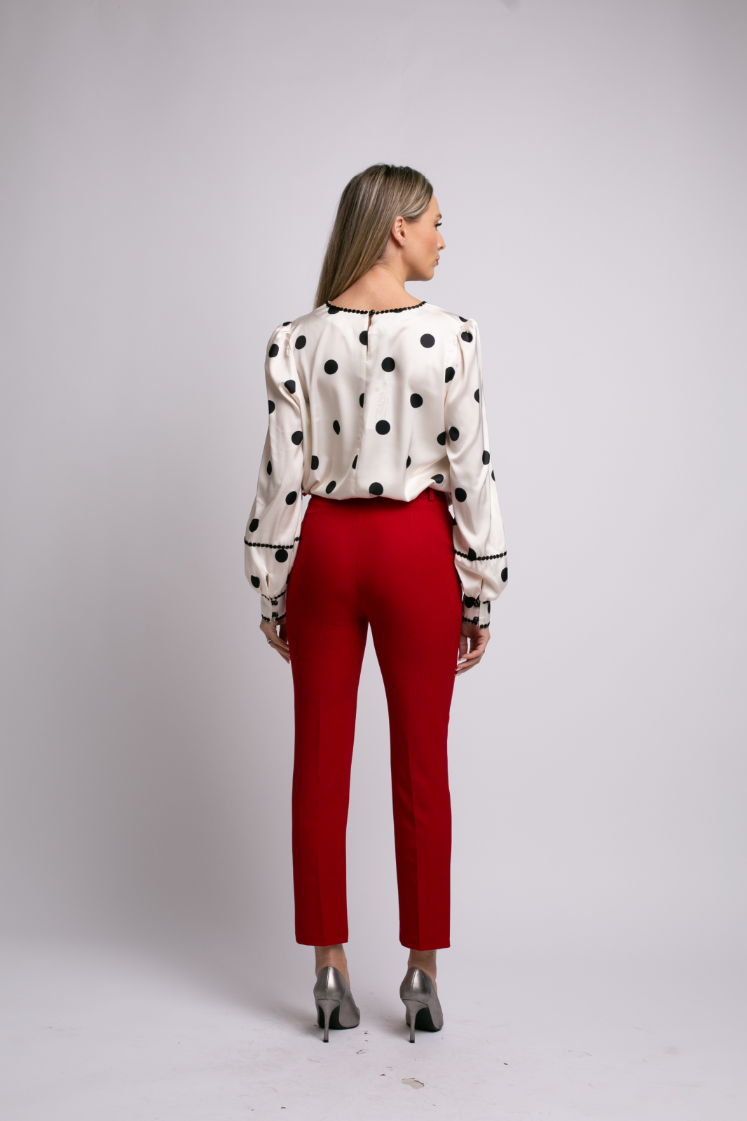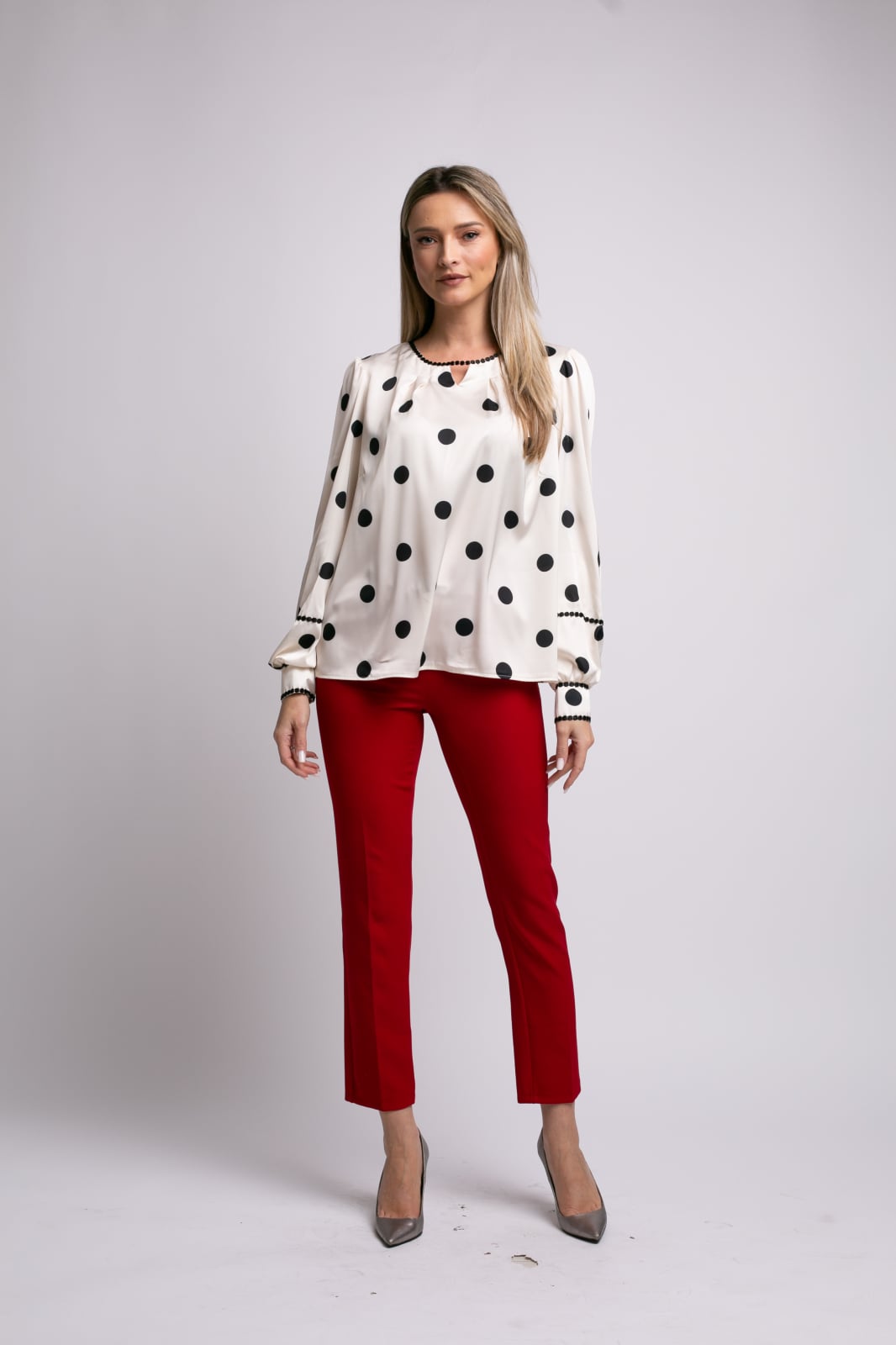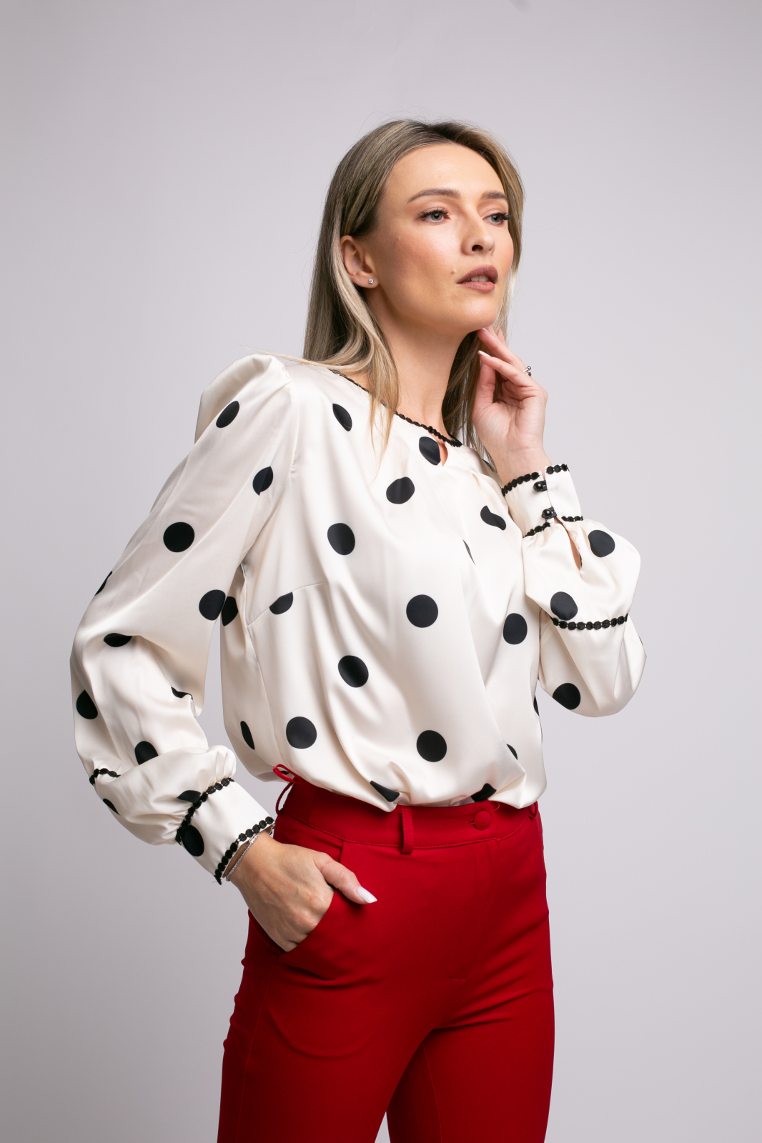 Bluză elegantă imprimată cu buline negre și este accesorizată cu dantelă la guler și manșete.