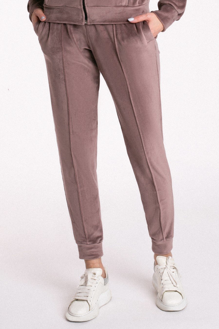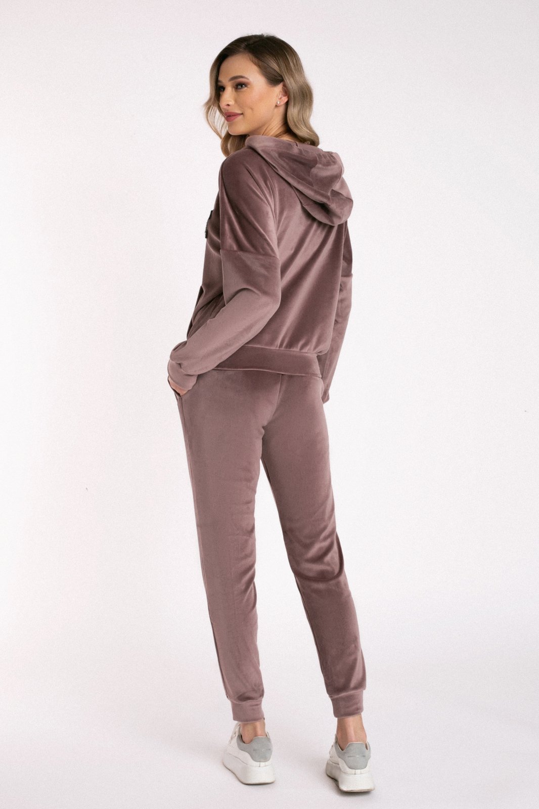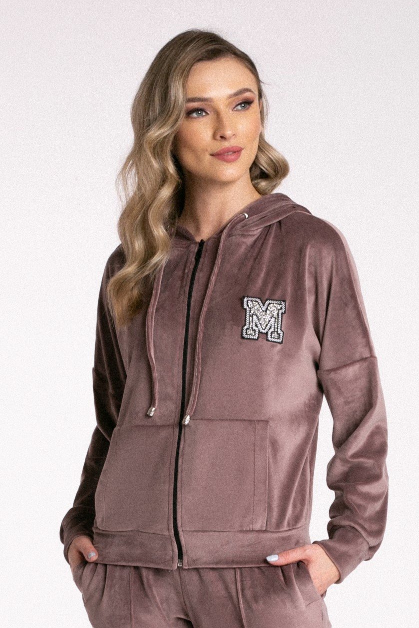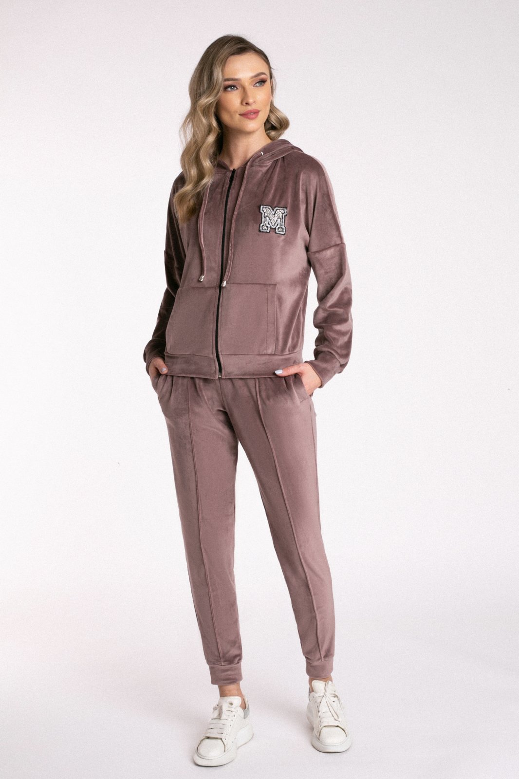 Trening din catifea cu accesoriu tip emblemă in piept, bluza are glugă și este încheiată cu fermoar.