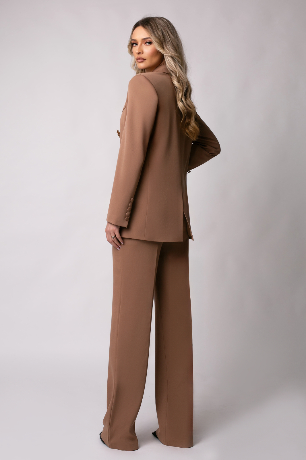 Costum elegant din două piese. Sacou drept cu rever lat ascuțit, încheiat în nasturi tip accesoriu. Pantalonul este larg, cu dungă și are două buzunare laterale.