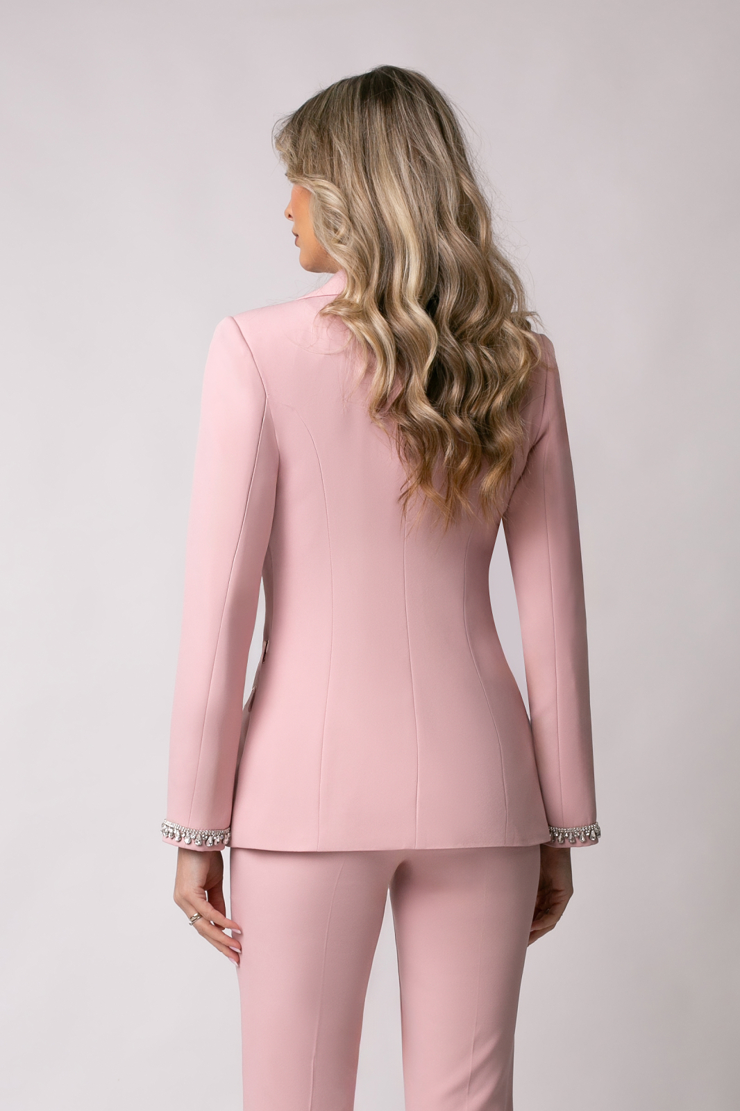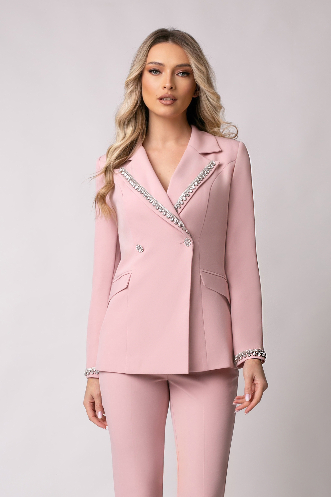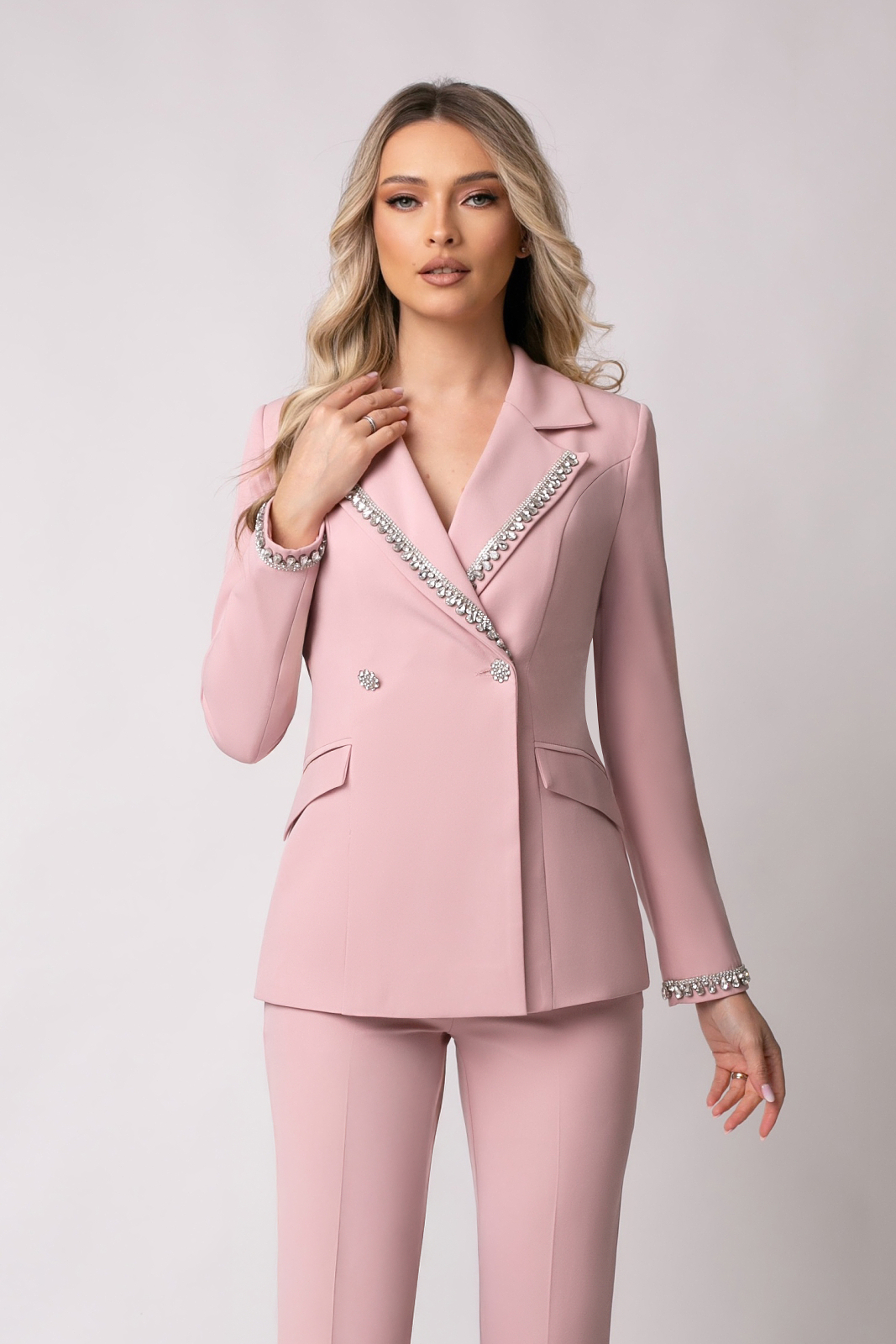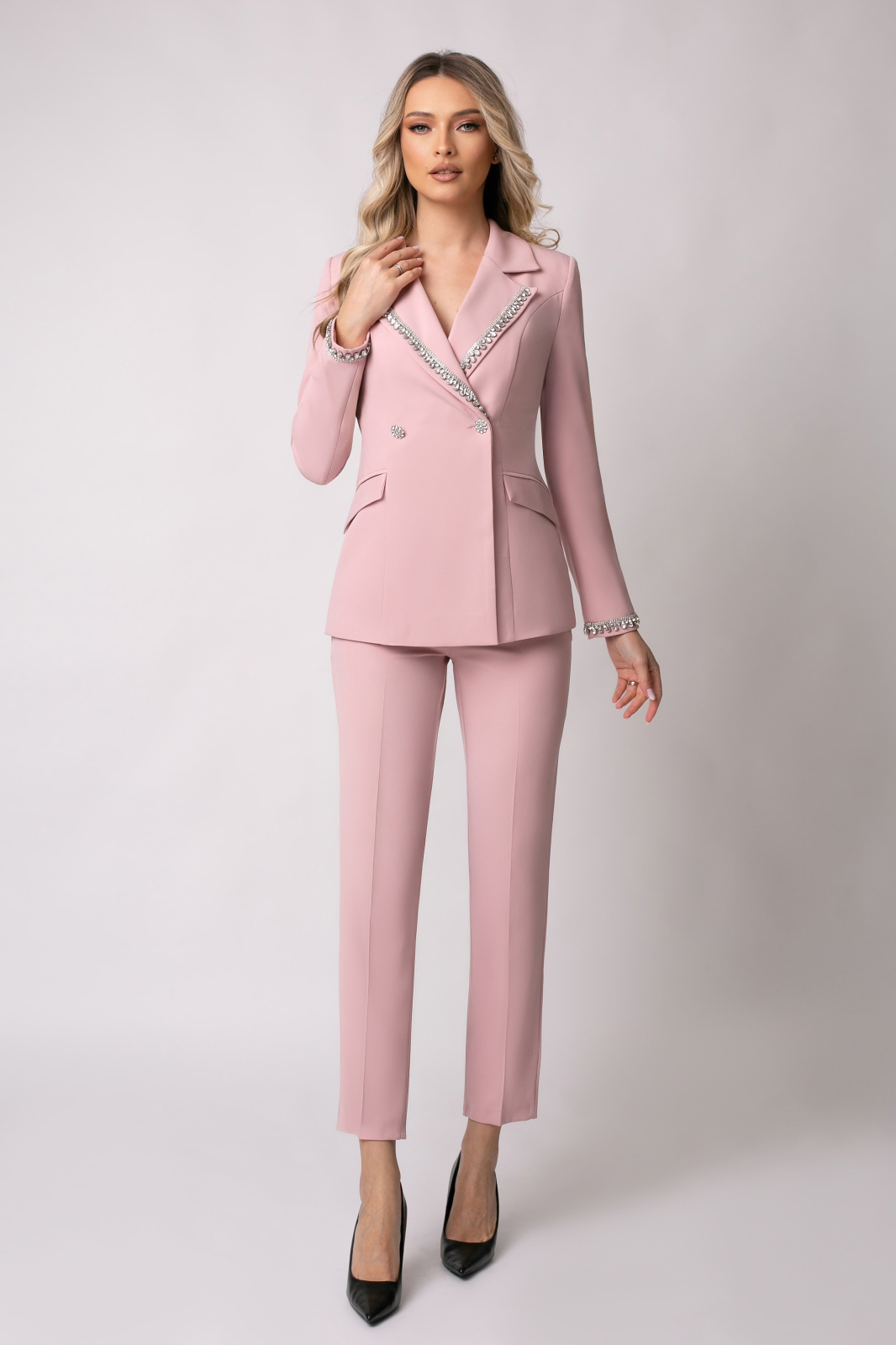Costum elegant din două piese. Sacou ușor cambrat cu rever ascuțit și mâneci accesorizate cu pietricele. Este încheiat în nasturi tip accesoriu. Pantalonul este conic, cu dungă și are două buzunare laterale.