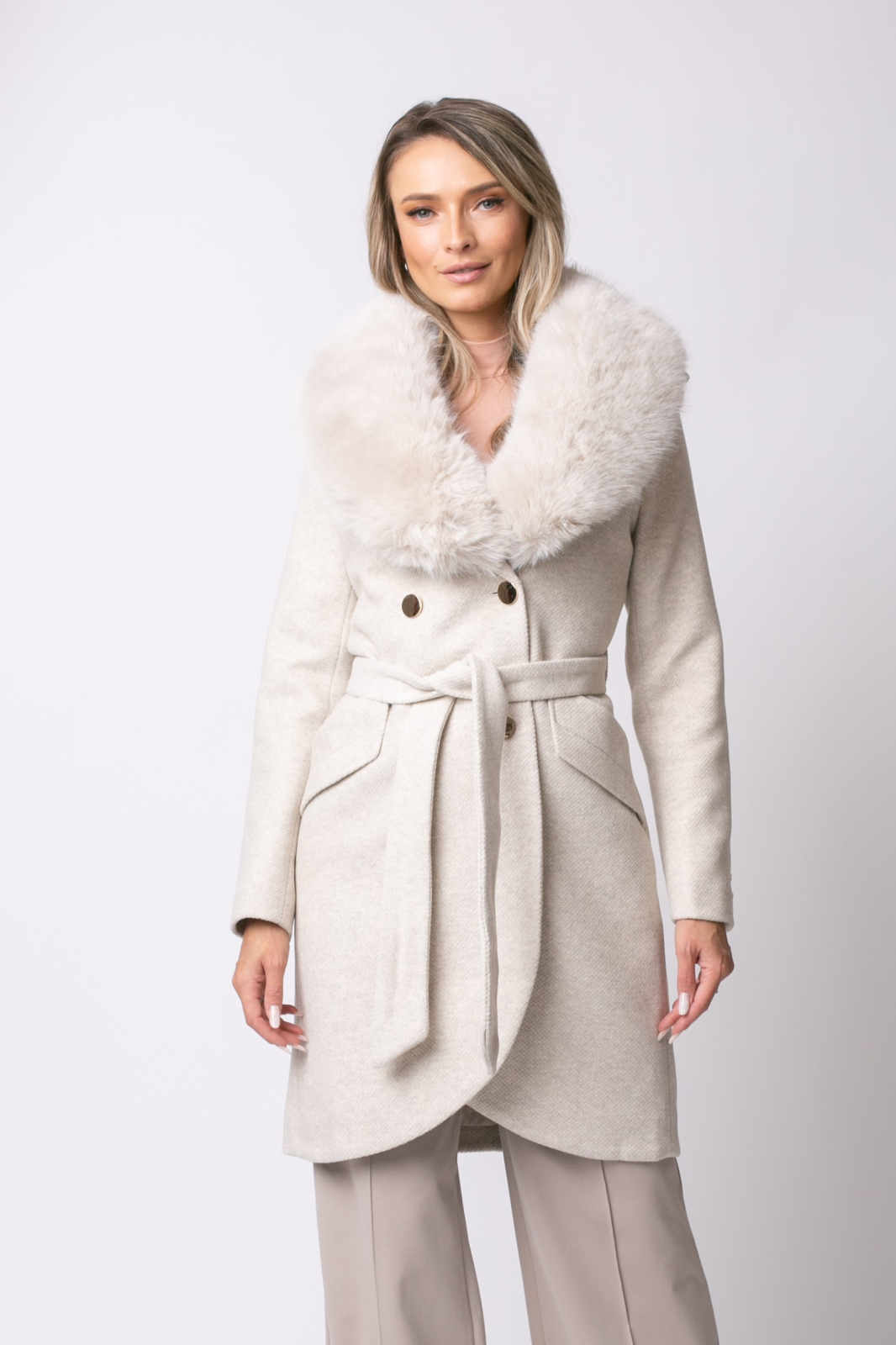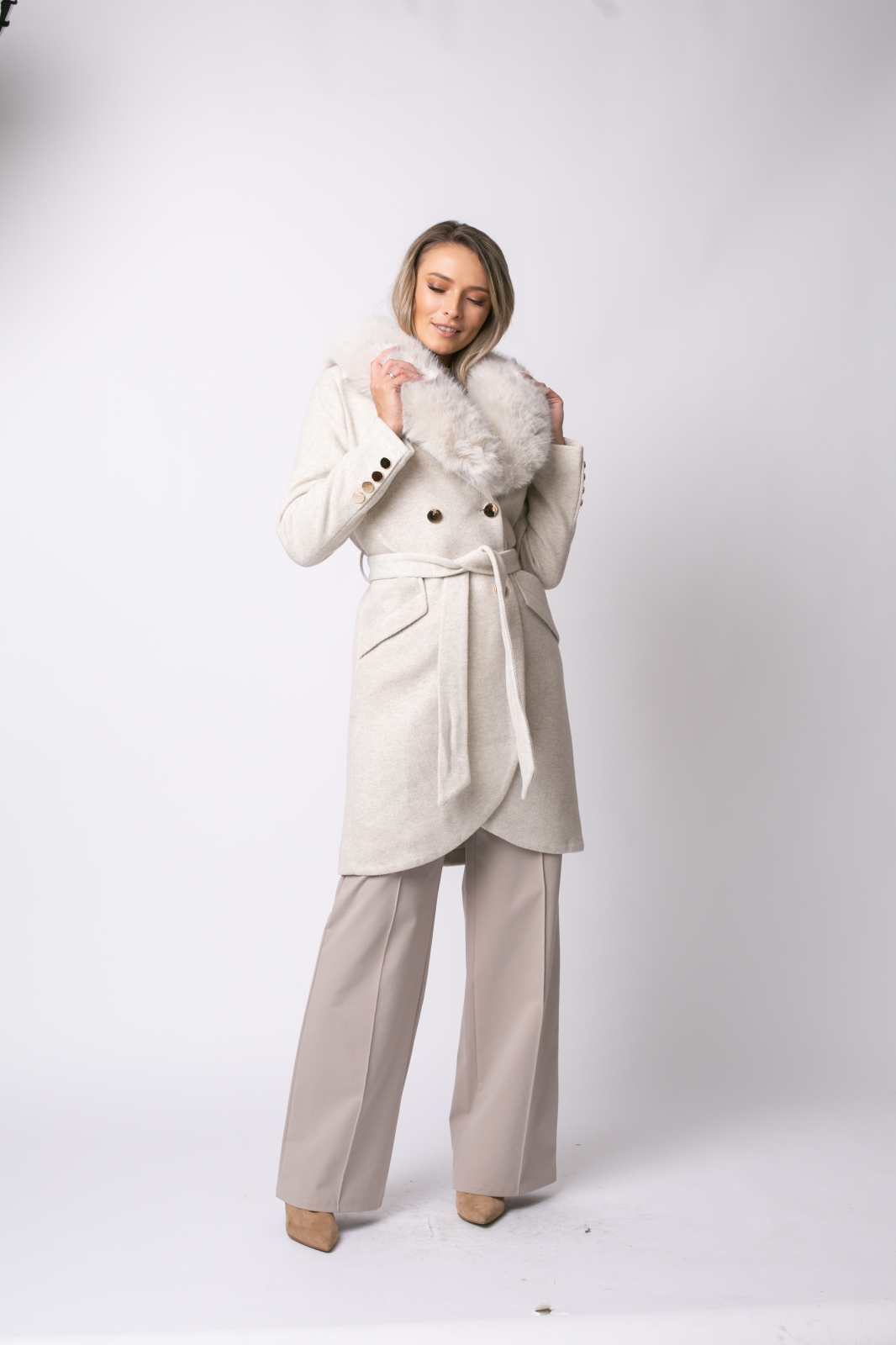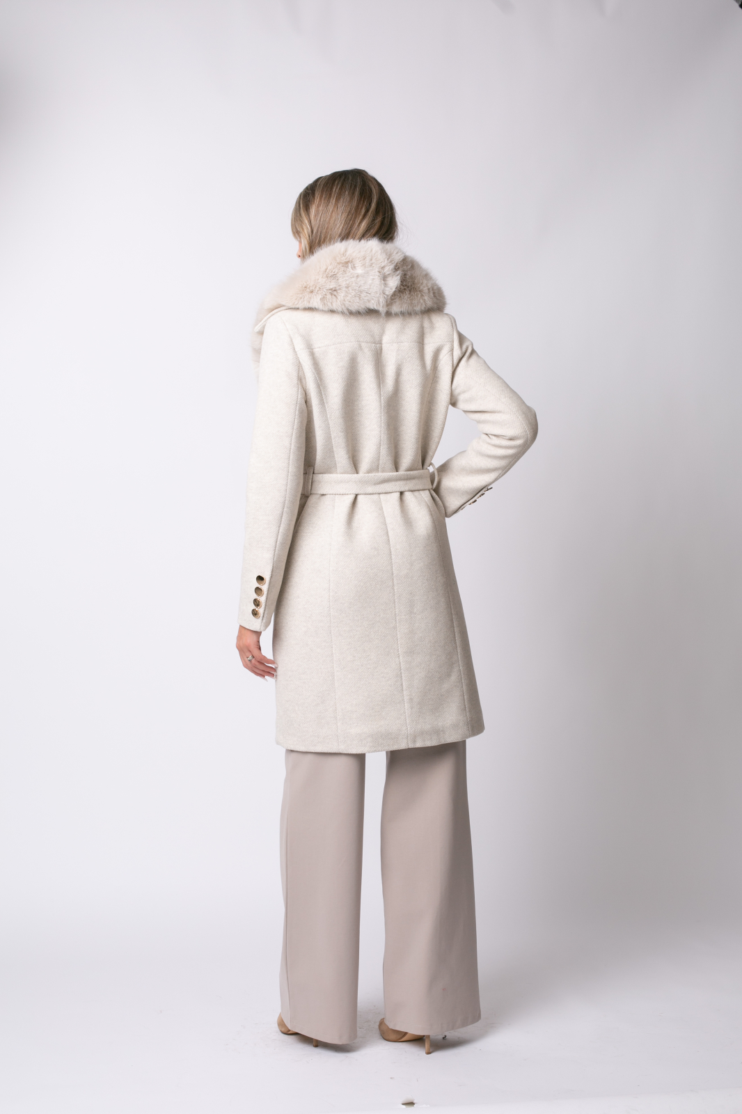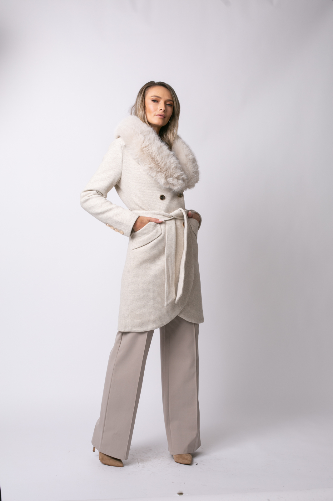 Palton din lâna midi cu buzunare laterale și cordon detașabil în talie. Se încheie in nasturi, gulerul din blană este detașabil.
