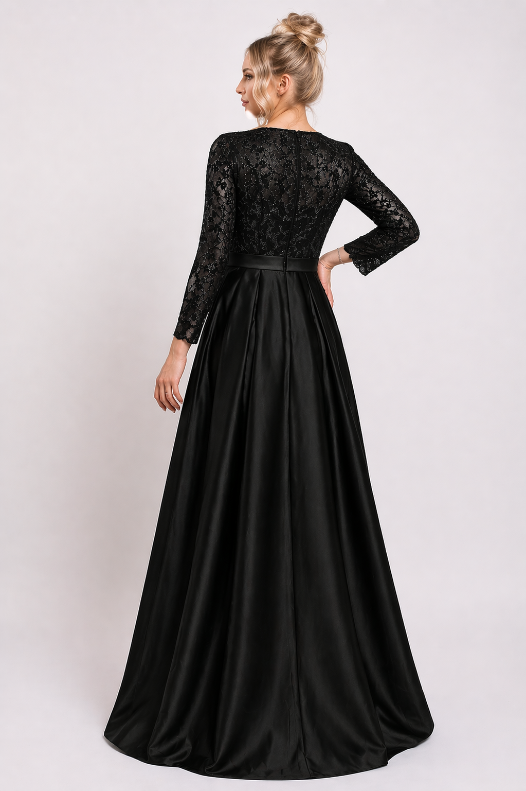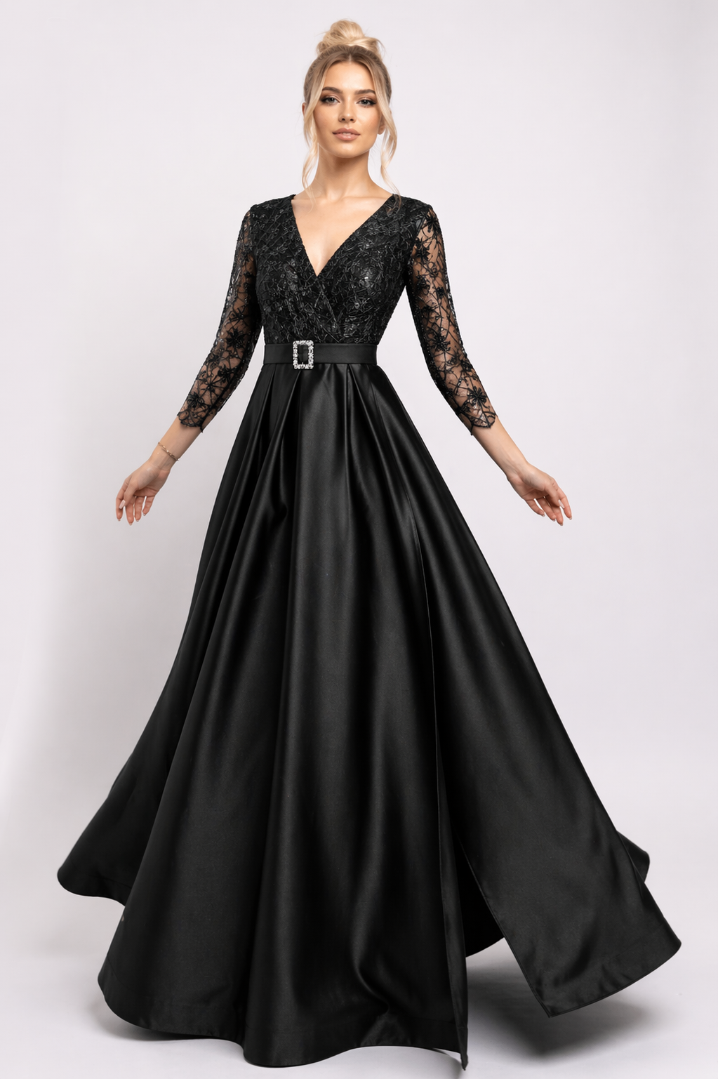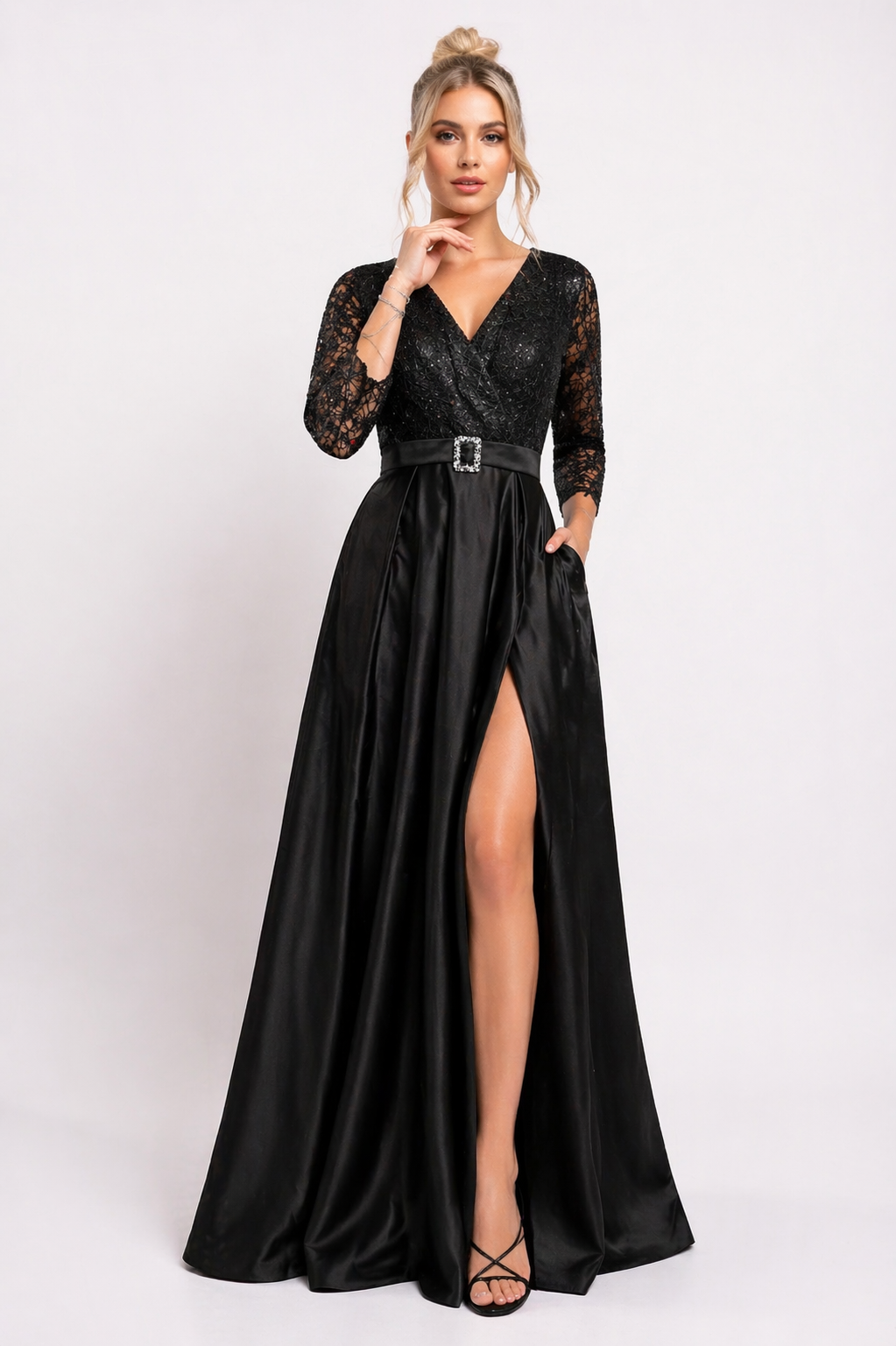 Rochie elegantă lungă accesorizată cu dantelă fină și paiete. Are curea detașabila, crepeu pe picior, bust parte peste parte și mâneci trei sferturi.