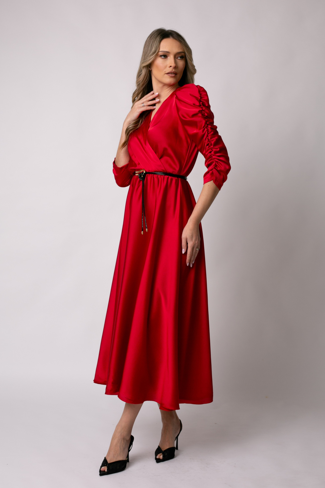 Rochie de ocazie din satin cu mâneci trei sferturi crețe . Are o curea detașabilă în talie și bust parte peste parte.