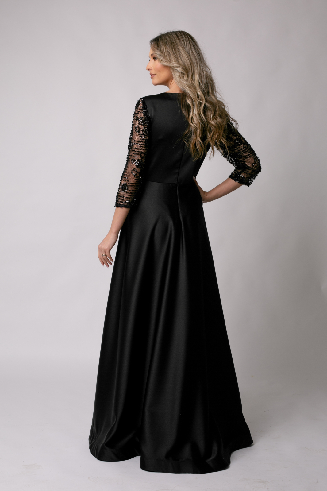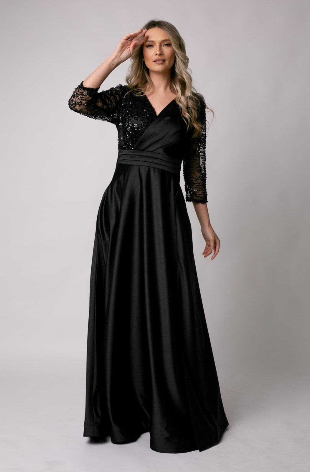 Rochie elegantă lungă accesorizată cu dantelă fină și paiete. Are talia evidențiată cu pliuri, crepeu pe picior, bust parte peste parte și mâneci trei sferturi.