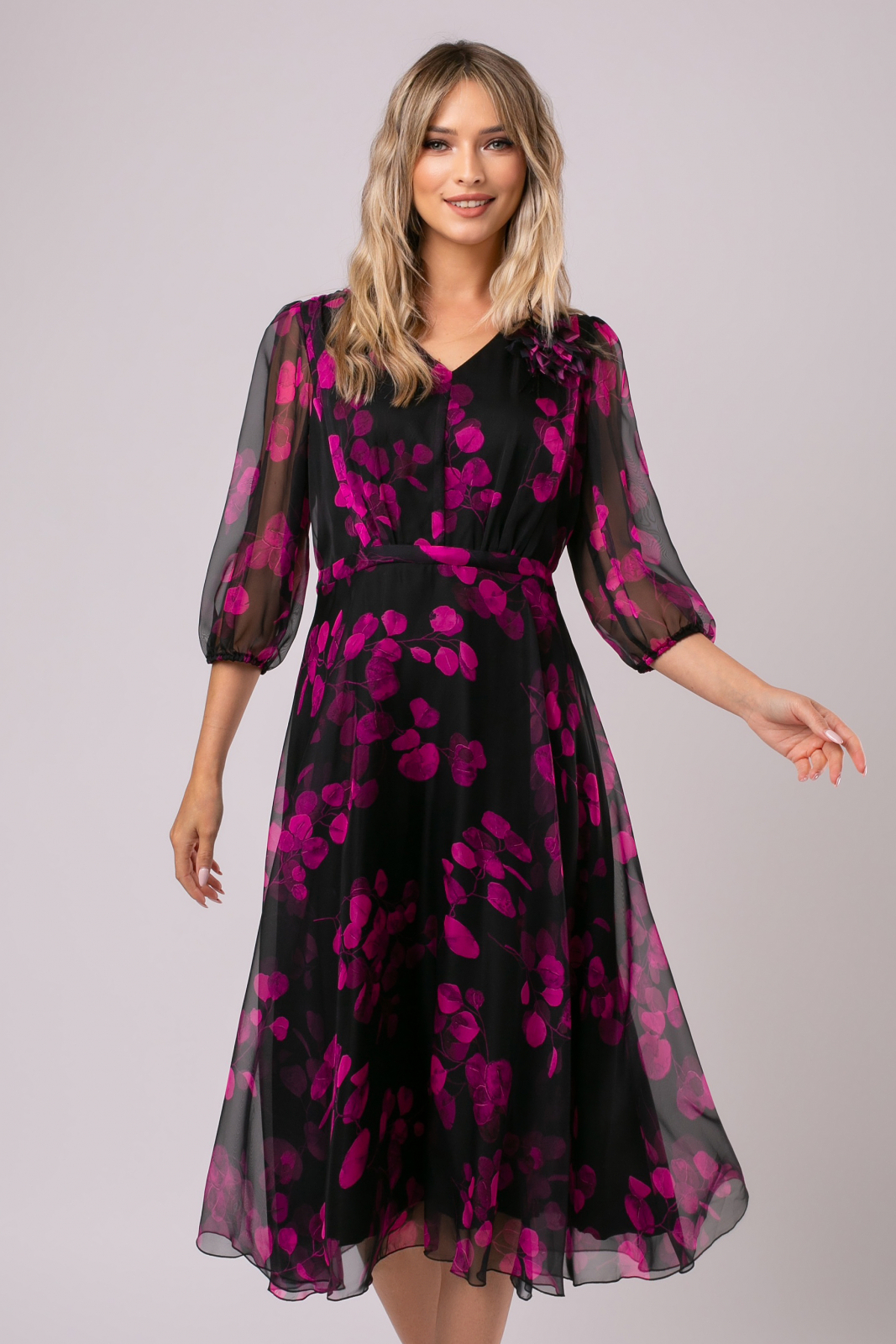 Rochie elegantă imprimată accesorizată cu o floare 3D în zona gâtului. Are mâneci bufanete și este realizată dintr-o țesătură fină.