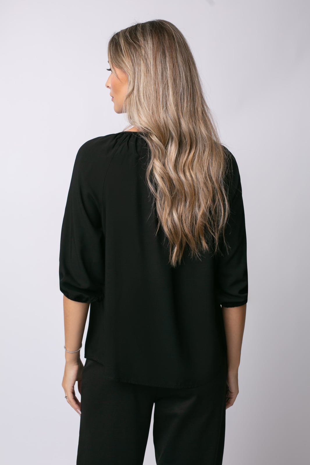 Bluză elegantă, tradițională neagră cu mâneci trei sferturi. Are croiul lejer și se prinde cu șnur la gât.