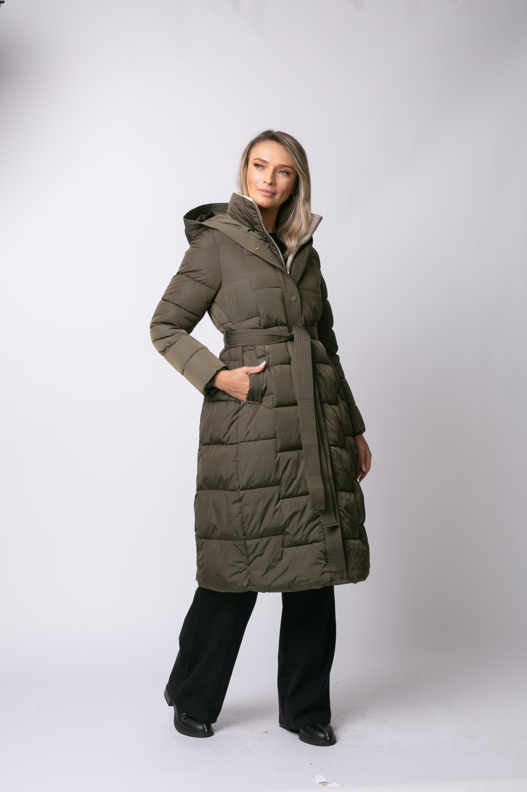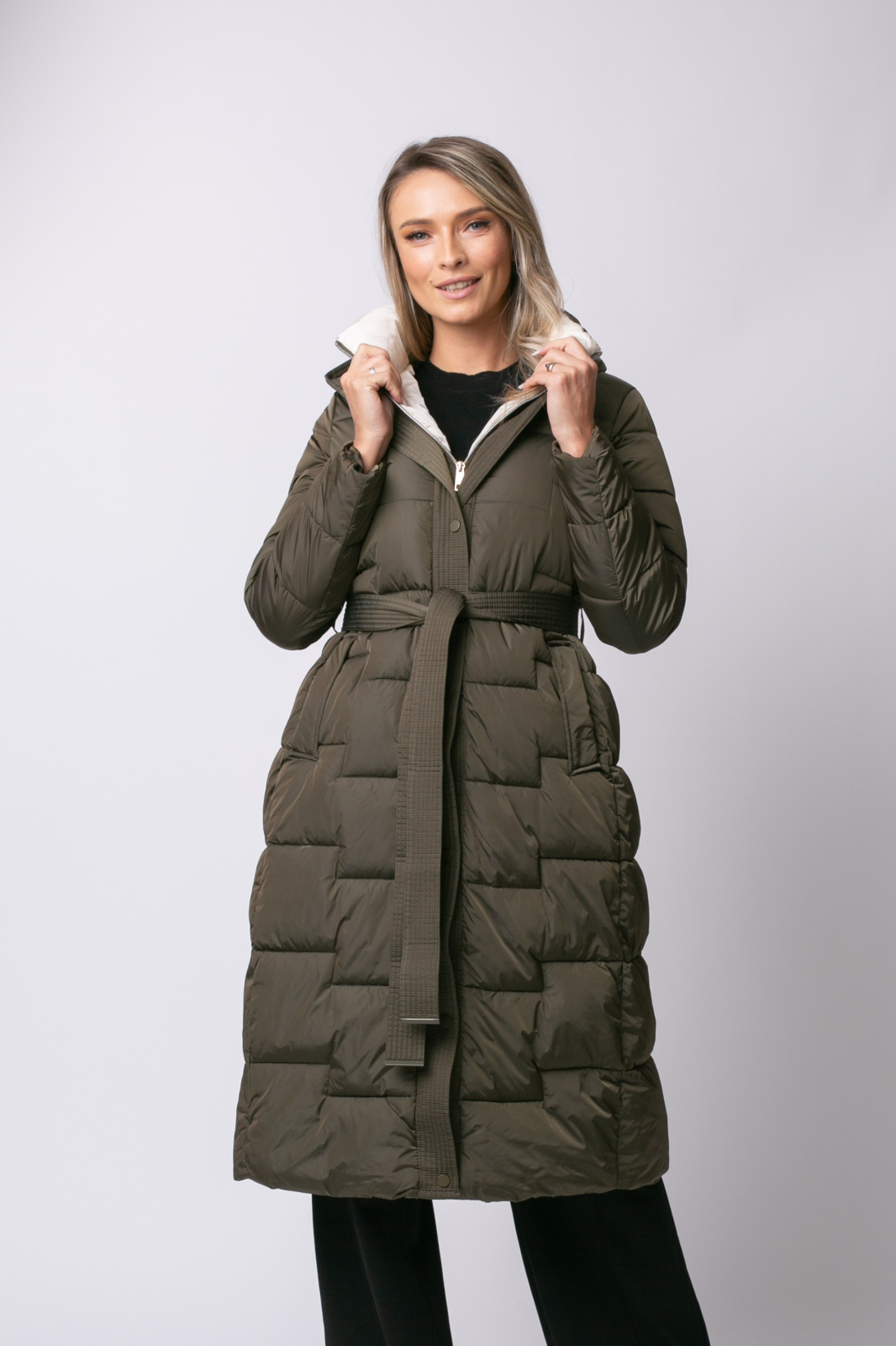 Geacă lungă matlasată cu glugă detașabilă și inchidere cu fermoar și capse. Are două buzunare laterale si cordon in talie.