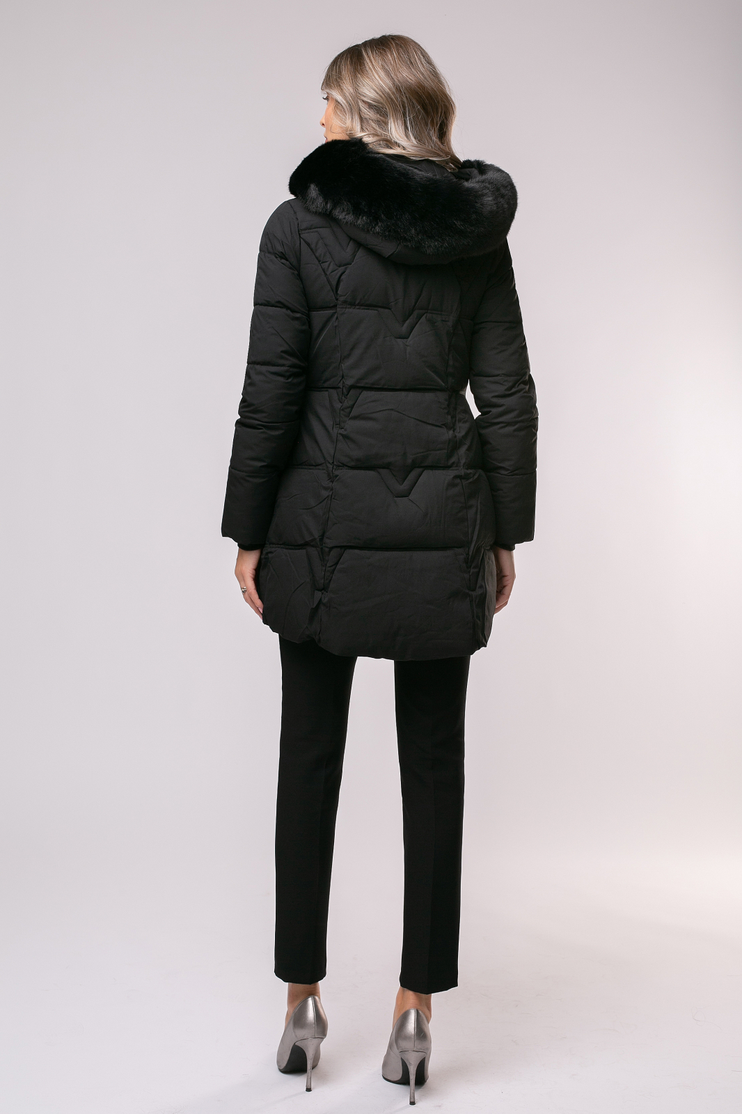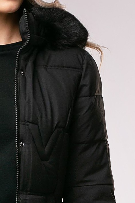 Geacă matlasată dreaptă din fâș cu glugă detașabilă și guler din blană. Are buzunare laterale și se încheie cu fermoar și capse.