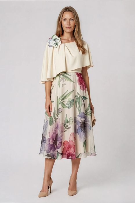 Rochie midi cu imprimeu floral accesorizată cu floare 3D pe umăr. Are decolteu rotund, umerii sunt acoperiti, bluza rochiei este stil capă.