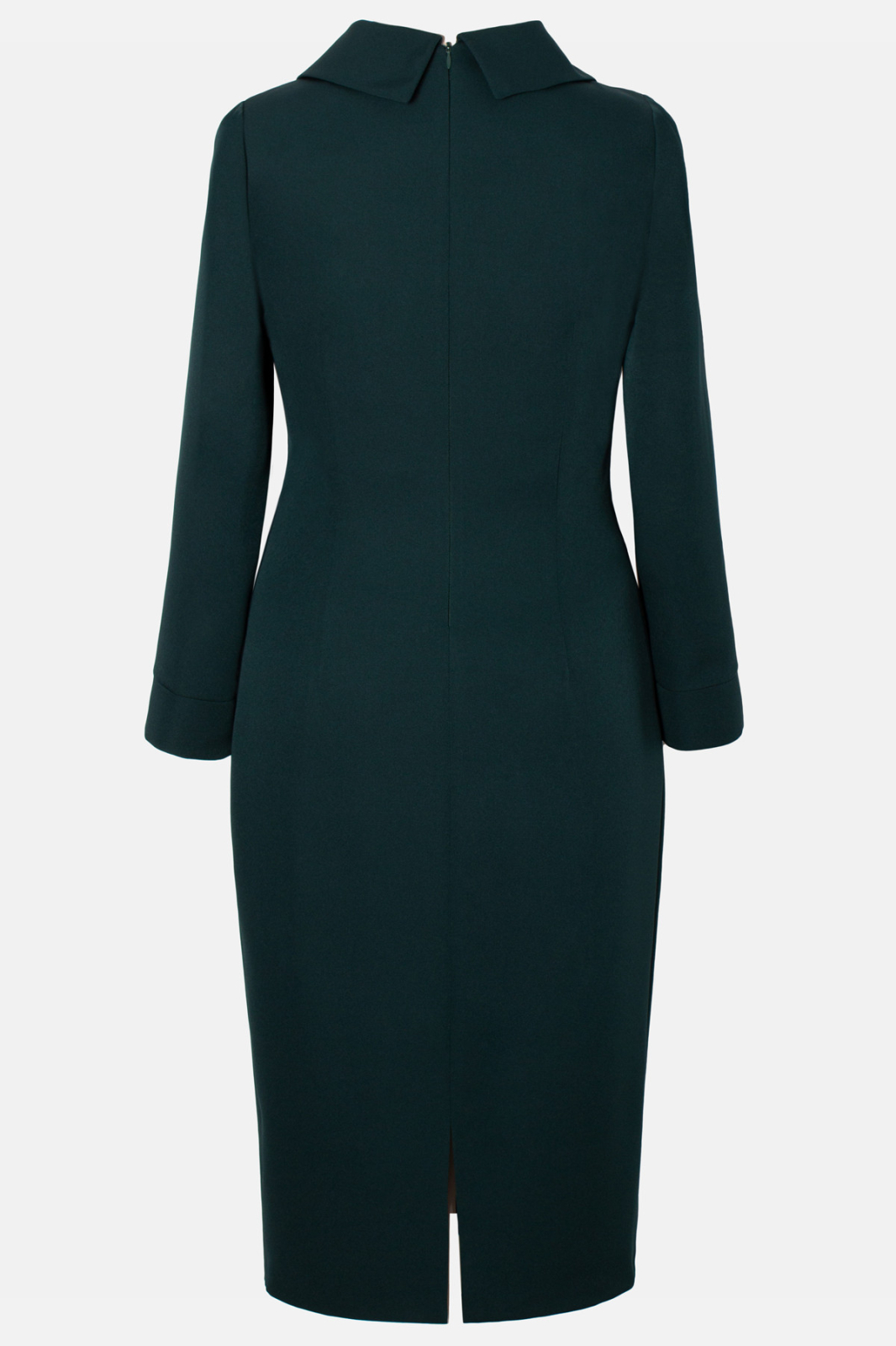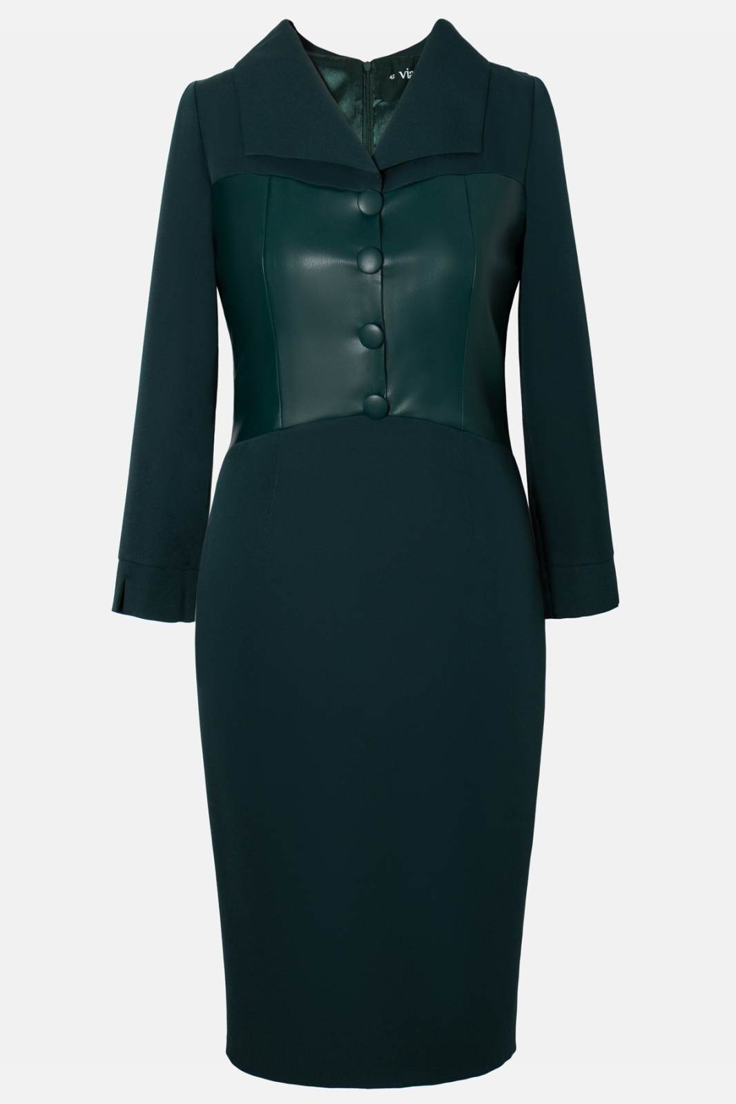 Rochie midi de zi cu inserție din piele ecologică in zona bustului, accesorizata cu nasturi îmbrăcați în aceeași nuanță. Captuseala in ton, decolteu in V cu guler amplu tip rever, mâneca lungă.
