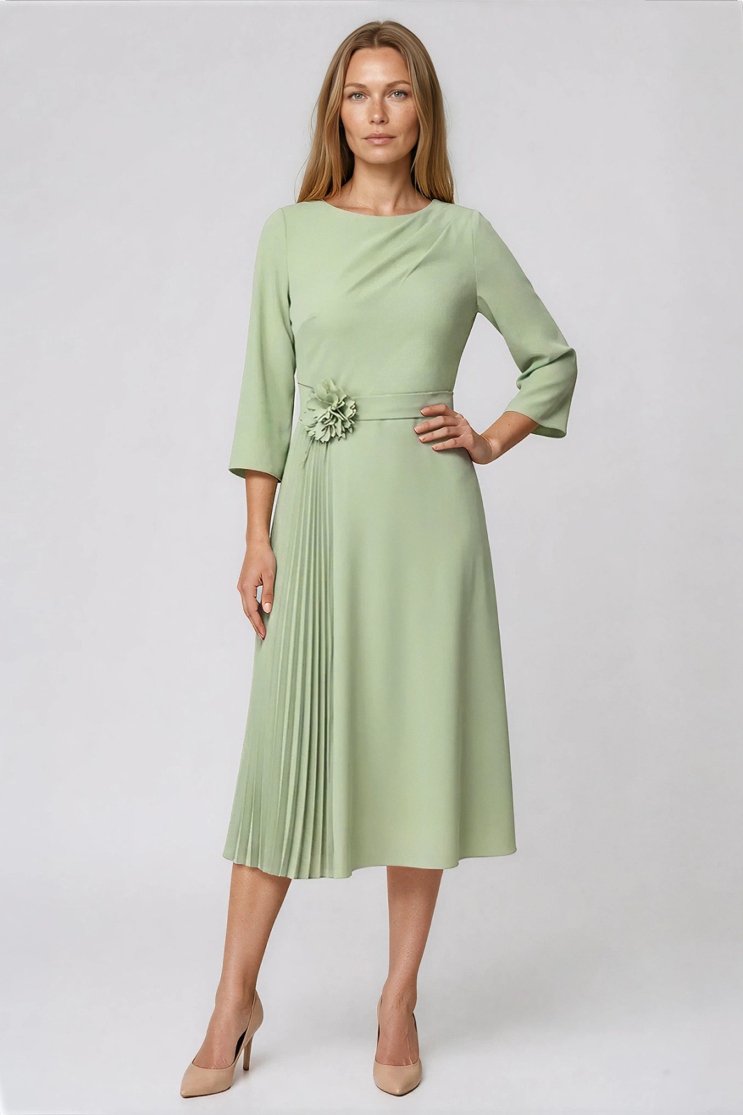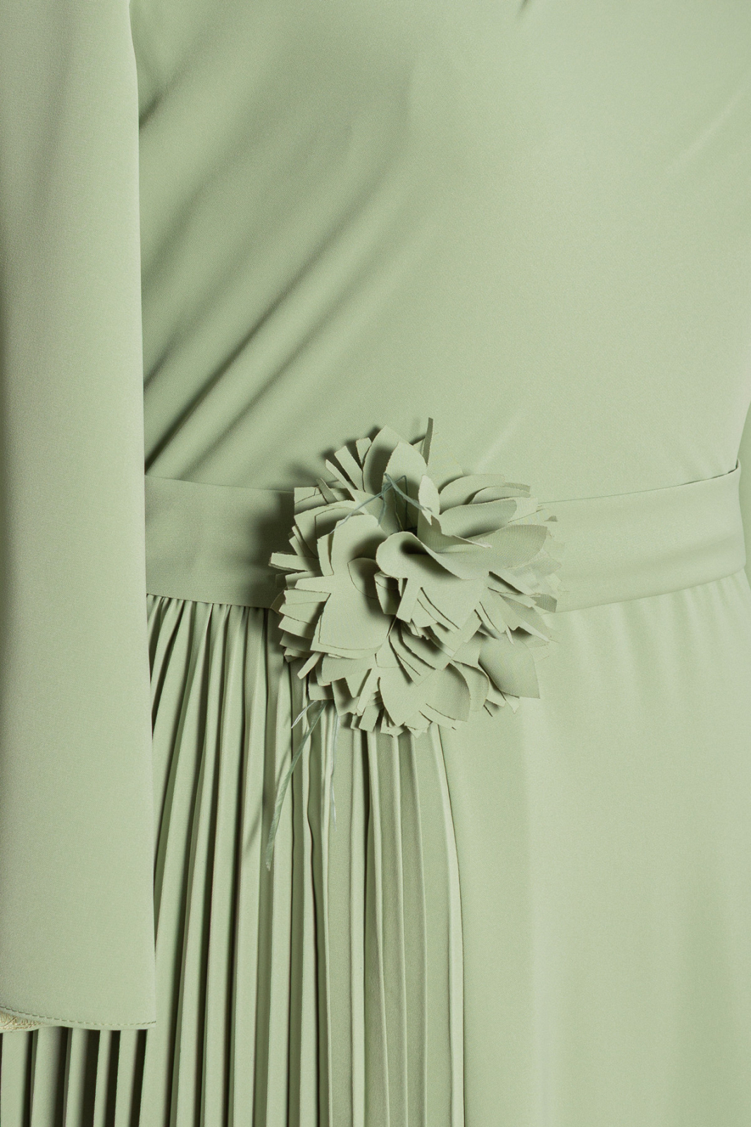 Rochie midi cu talie evidențiată printr-un cordon accesorizat cu floare 3D detașabilă. Are mâneci trei sferturi largi, despicate. Croiul este cloș și fusta are pliuri.