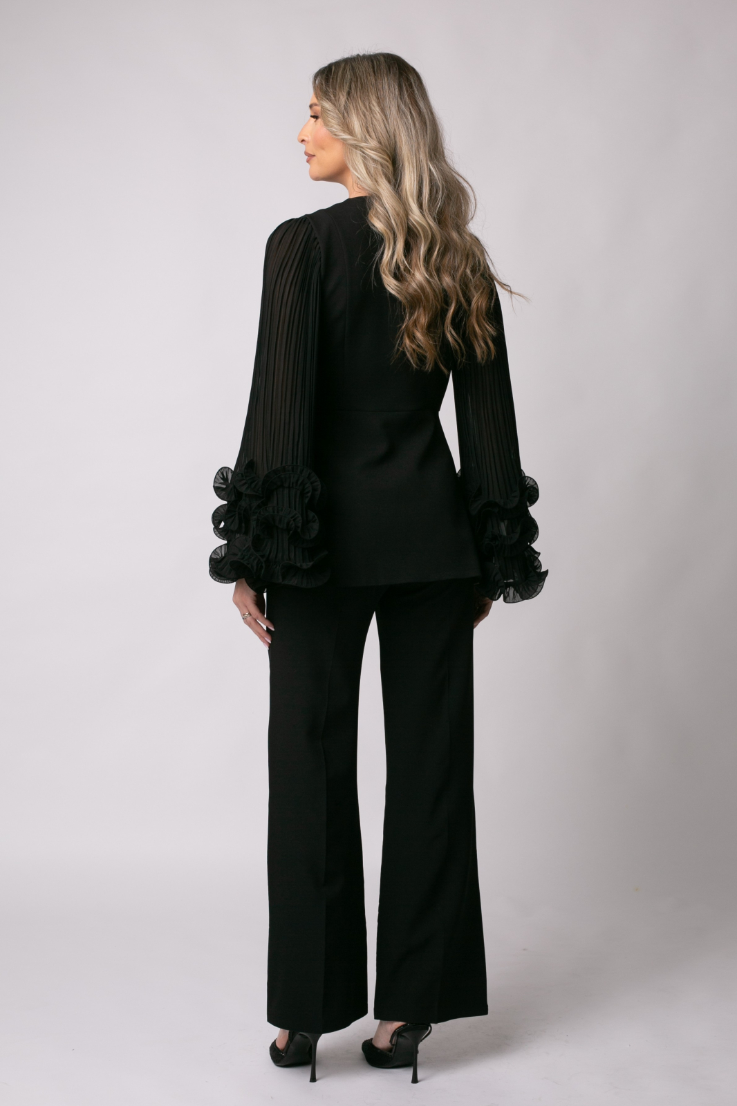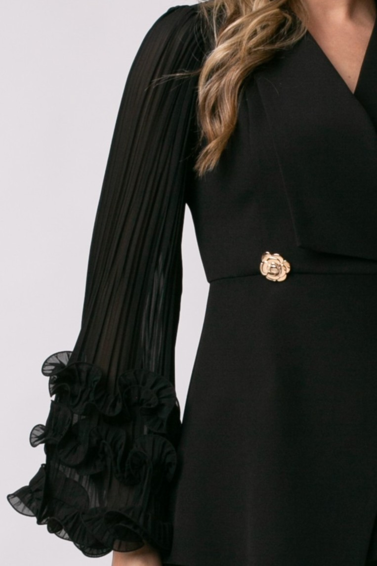Costum elegant din două piese. Sacou ușor cambrat cu rever ascuțit și mâneci largi, plisate din voal accesorizate cu volane. Este încheiat în nasturi tip accesoriu. Pantalonul este larg, cu dungă și are două buzunare.