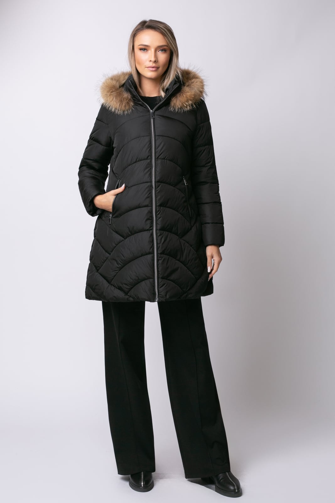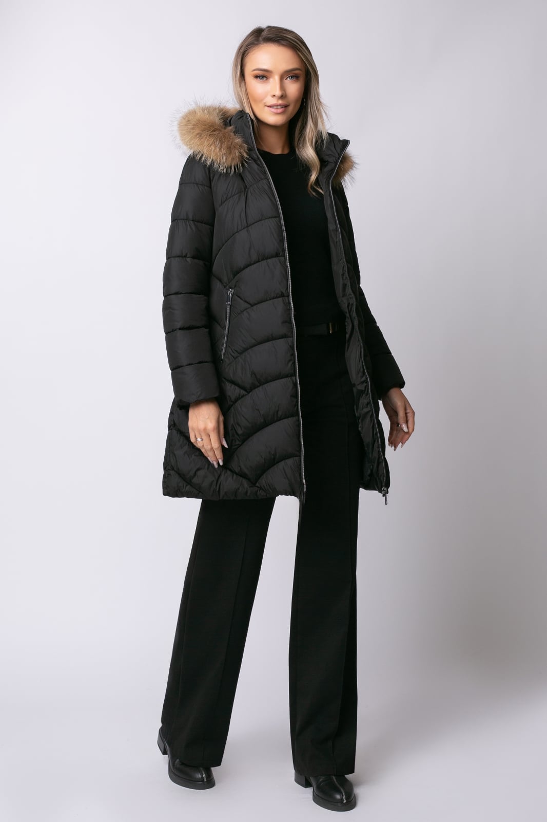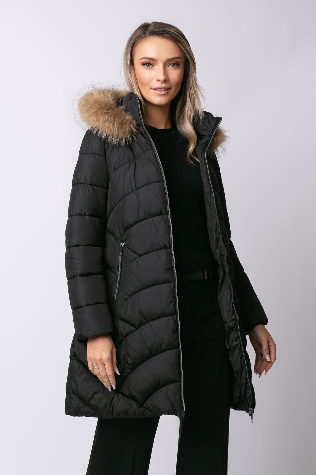 Geacă de iarnă matlasată din fâș pentru sezonul de iarnă. Are glugă cu blană și buzunare laterale încheiate cu fermoar.