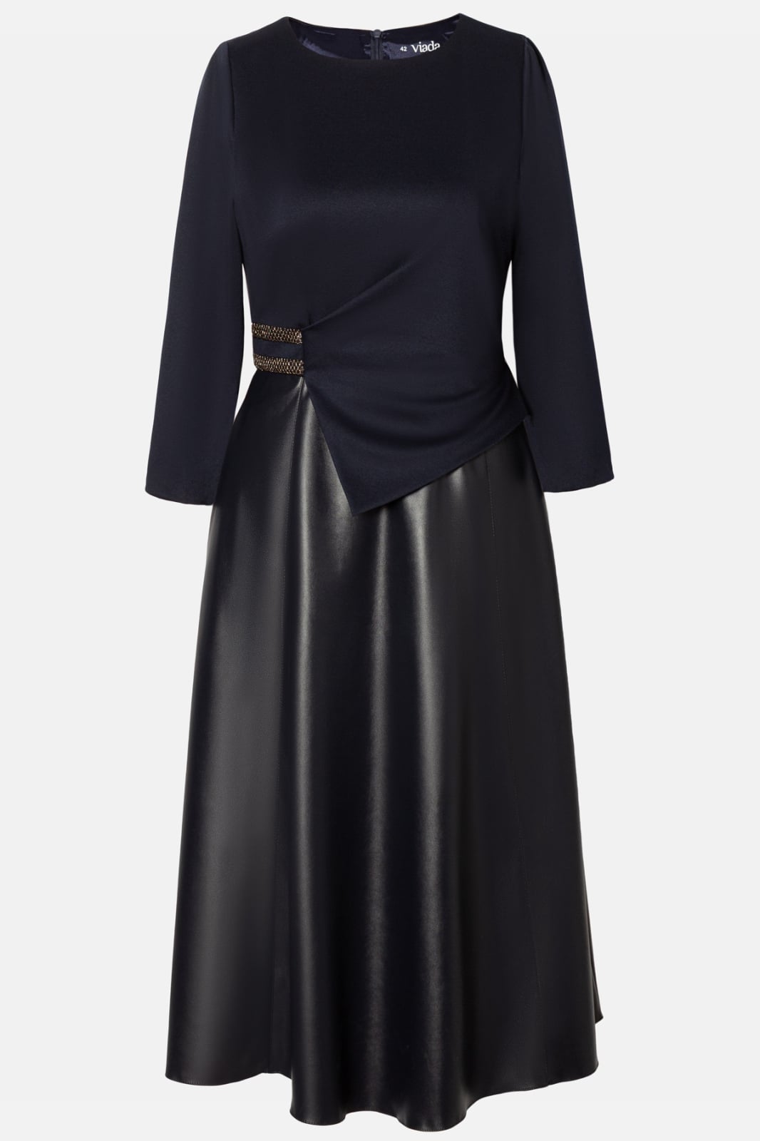 Rochie midi cu fusta din piele ecologică și accesoriu în talie. Are croiul cloș și se încheie la spate cu fermoar ascuns.